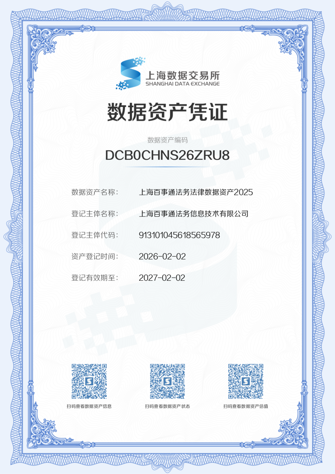 近日,上海百事通法务信息技术有限公司完成了法律数据资产入表,正式获得由上海数据交易所颁发的《数据资产凭证》(编码:DCB0CHNS26ZRU8)。